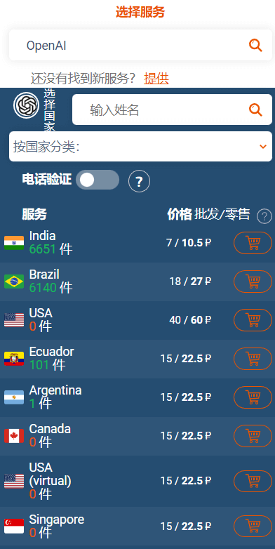 这里选的是韩国,这是因为我们使用韩国的代理,但是我们最好选择印度。然后到我们的接码网站上去。在左侧搜索OpenAi,然后点击印度。